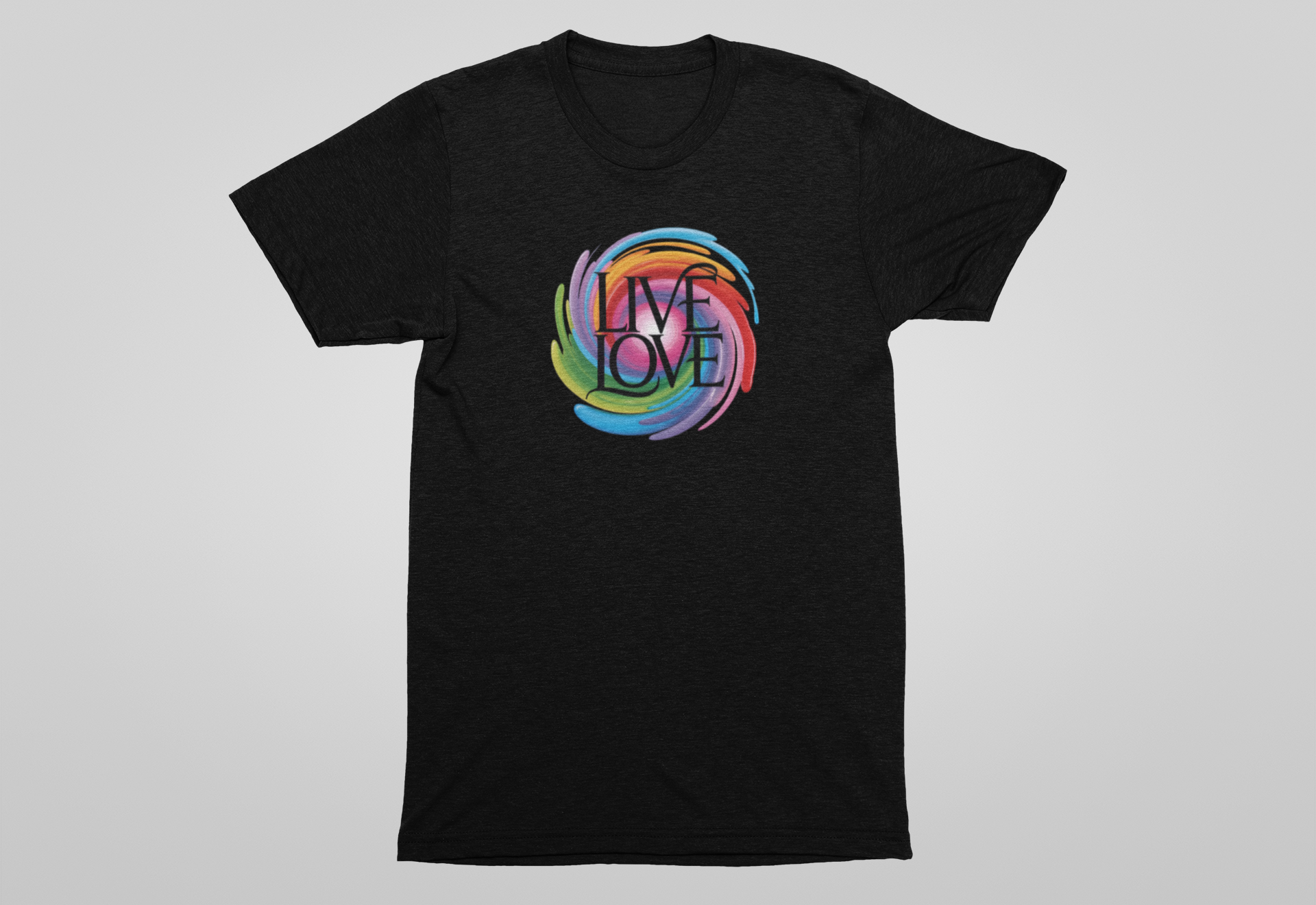 This shirt also comes in multiple Live Love styles so you can choose the design that resonates most with you — script, block, or color swirl.